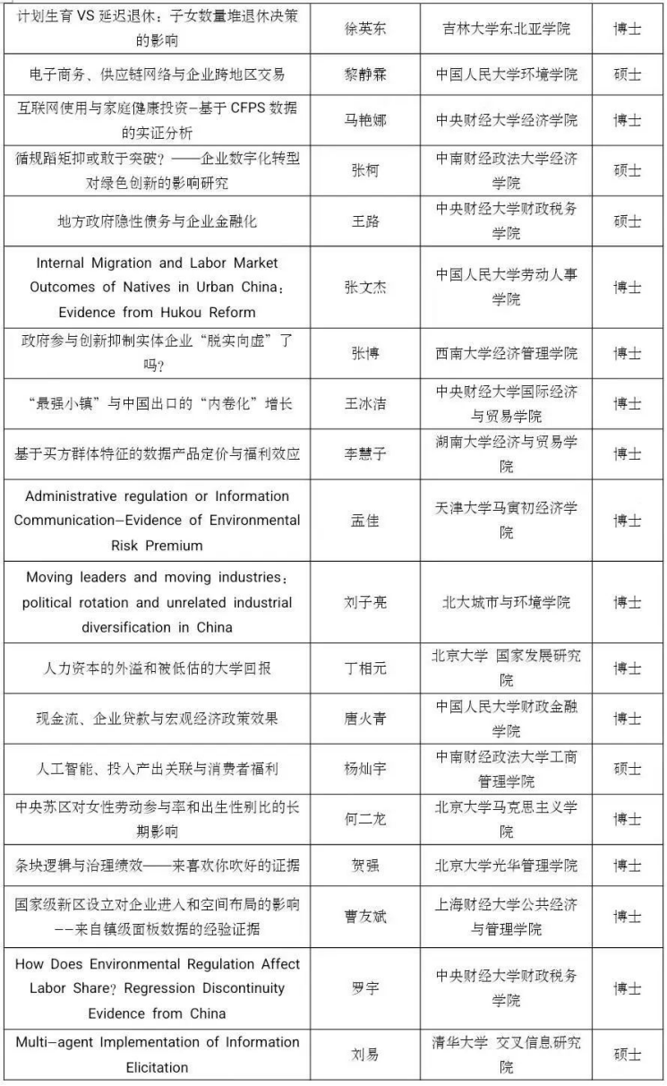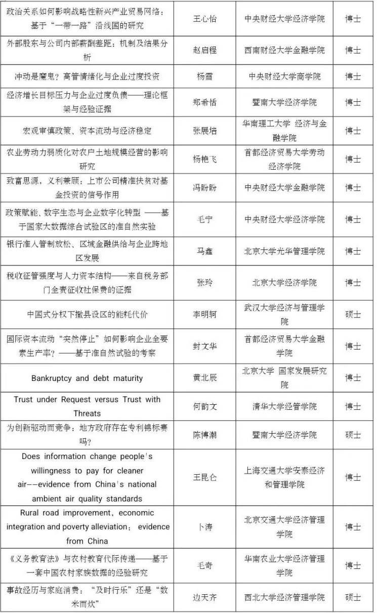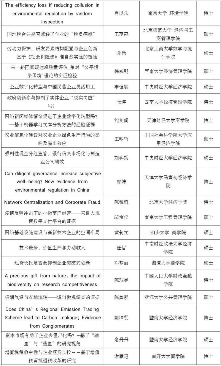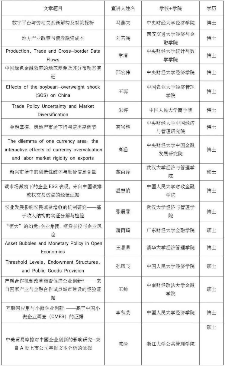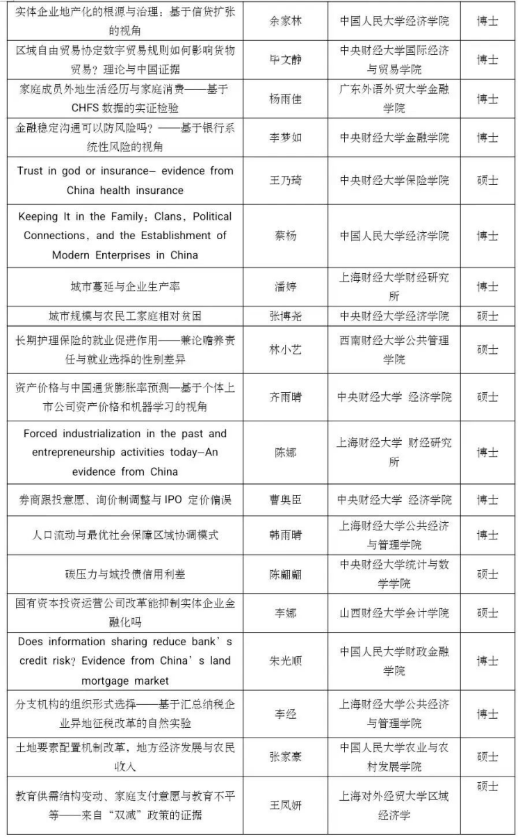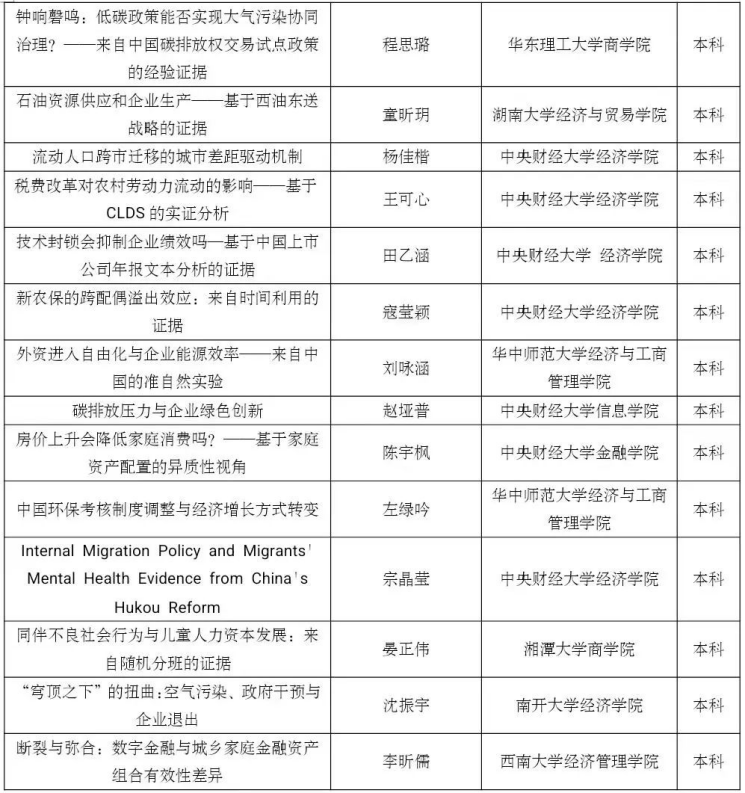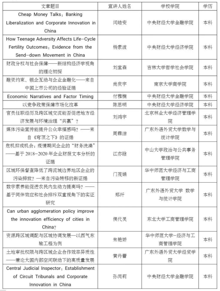党的二十大报告指出,“教育、科技、人才是全面建设社会主义现代化国家的基础性、战略性支撑”。为了学习、贯彻和落实党的二十大关于教育和人才建设的精神,beat365在线体育官网登录入口联合中国经济学年会、中国青年经济学家联谊会主办第五届未来经济学家论坛。本论坛坚持“公平、公正、公开”的原则,鼓励思想争鸣、学术创新,旨在为未来有志于从事经济学研究的全国高校在校学生(本科生和研究生)提供一个观点交流、思想碰撞的学术交流平台。本次论文征集环节共收到612篇投稿论文,经过评审论证和评审,最终遴选出126篇入围会议,名单如下,恭喜各位入选的同学: