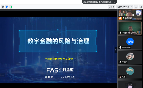 2022年5月30日上午10点,中科金审(北京)科技有限公司总裁邓昌智博士应邀加入beat365在线体育官网登录入口“数字金融理论与实务”线上课堂,以“数字金融的风险与治理”为题,为同学们带来了一场精彩纷呈的讲座。