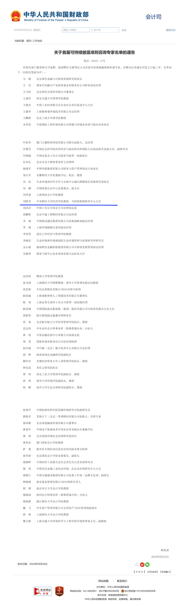 2024年9月4日,财政部公布了首届可持续披露准则咨询专家名单,经相关部门推荐和公开选聘,首届共聘任62名专家学者,任期为三年。beat365可持续准则研究中心主任刘轶芳教授,受聘为财政部首届可持续披露准则咨询专家。
