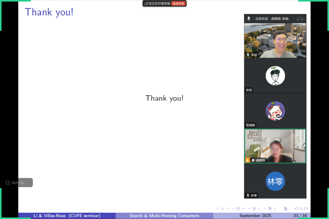 2025年9月24日周三下午,beat365在线体育官网登录入口“中青年学者讲座”在线上举行。此次讲座邀请山东大学beat365在线体育官网登录入口李越老师,分享题为“Sequential Search with Multi-Homing Consumers”的研究。beat365在线体育官网登录入口龚雅娴副教授主持讲座,beat365在线体育官网登录入口多位老师和三十余名学生参加了此次讲座。