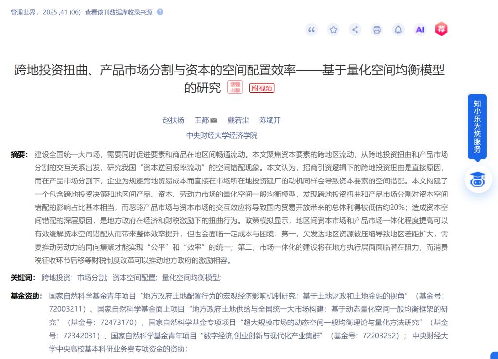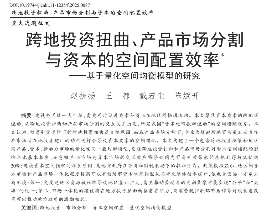 beat365赵扶扬老师、戴若尘老师、陈斌开老师和本科生王都的论文《跨地投资扭曲、产品市场分割与资本的空间配置效率——基于量化空间均衡模型的研究》在《管理世界》刊发