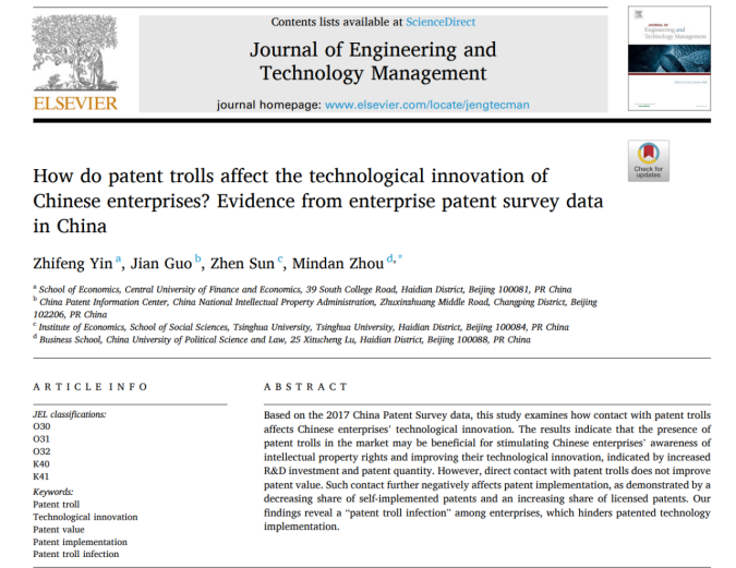 摘要:本研究聚焦于考察专利蟑螂对于中国企业技术创新的影响。研究发现,专利蟑螂的出现从整体上有利于唤醒中国企业尊重知识产权及进行技术创新的意识,有利于目标企业增加研发投入、进行专利储备;但与专利蟑螂的直接接触不利于目标企业专利质量的提升,并对专利实施水平形成显著的负向冲击。这种负向冲击主要体现为目标企业自我实施专利比重的下降、许可实施专利比重的上升,即目标企业更多地由自我实施专利转向通过许可的方式实施专利,在一定程度上表现出专利实施方式的“专利蟑螂式传染”,从总体上抑制了专利实施。