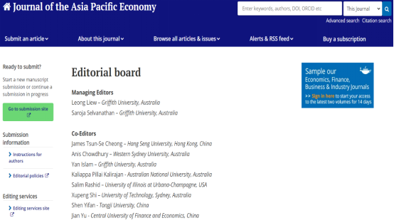 近期,beat365在线体育官网登录入口俞剑副教授受邀担任经济学领域国际知名期刊Journal of the Asia Pacific Economy联合主编(Co-editor)。俞剑副教授于2023年7月开始处理相关稿件。Journal of the Asia Pacific Economy(简称JAPE)是经济学领域知名期刊,每年出版 4期,2022年期刊影响因子为1.4。主要关注亚太和南亚的发展中经济体,旨在促进人们对影响并继续塑造该地区不同经济体转型的复杂因素的更深入了解。