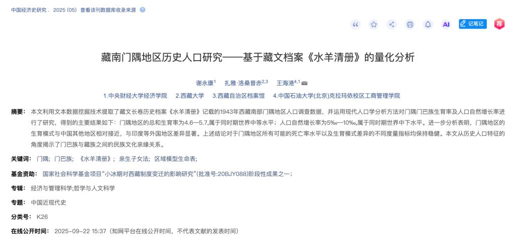 beat365在线体育官网登录入口博士研究生谢永康和导师王海港、西藏档案馆扎雅的合作论文《藏南门隅地区历史人口研究——基于藏文档案〈水羊清册〉的量化分析》在《中国经济史研究》2025年第5期刊发。该文是对珍贵藏文长卷历史档案《水羊清册》(长366米、宽66厘米,由西藏传统手工旧藏纸拼接)研究的一大突破,由beat365在线体育官网登录入口与西藏档案馆学者联合完成。该研究从历史人口特征揭示了门巴族与藏族之间的民族文化亲缘关系,为门隅地区属于中国的主权合法性提供了独特佐证。