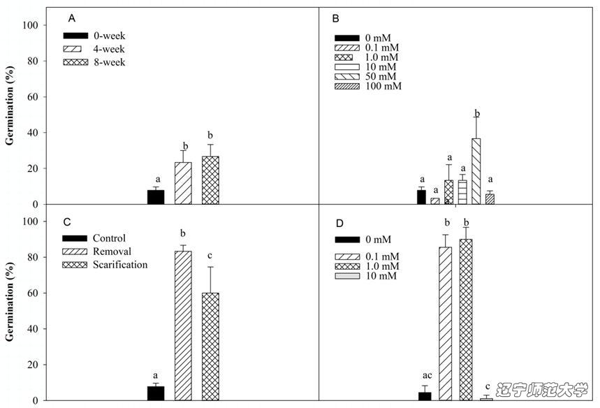 Figure 3 Effect of (A) cold stratification, (B) NaNO3concentrations, (C) testa treatment and (D) GA3concentrations on germination of black seeds of Suaeda glauca.