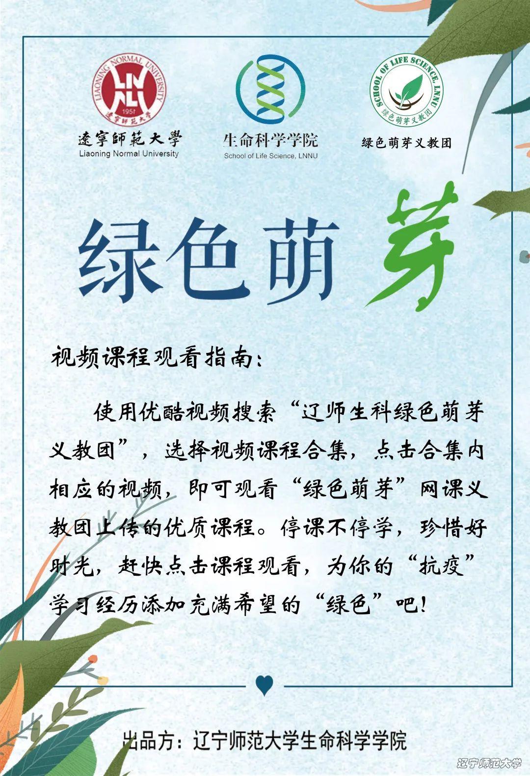 目前,“绿色萌芽”网课义教团的全部视频课程已经制作结束,并已上传至优酷视频站。需要学习课程请使用优酷视频搜索“辽师生科绿色萌芽义教团”,选择合集内相应的课程即可。