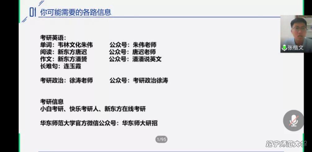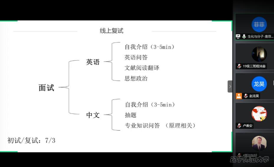 6月8日晚上6:30,bat365通过腾讯会议APP举办线上“开往春天的地铁”考研指导与经验分享交流会之华东师范专场。本次交流会的主讲嘉宾有2016级生物科学(师范)专业张楷文同学、2016级生物科学(师范)专业王晓凤同学以及2016级生物科学(师范)专业袁菲菲同学。本次交流会由学习部干事宋芊芊主持,2017级、2018级、2019级部分同学参加本次交流会。