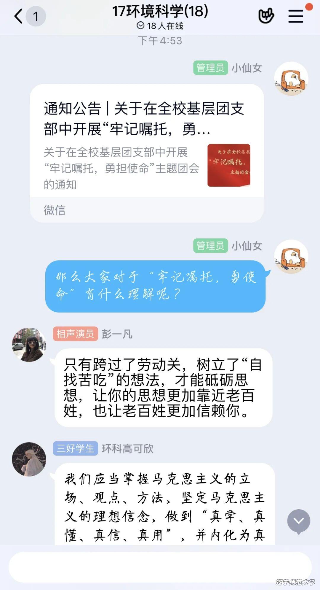 接着,各班团支部成员打开麦克踊跃发言,表达自己的想法和观点。同学们结合自身实际情况,围绕其中的几篇报道说出了自己的真情实感,并向其他同学分享了自己的收获。