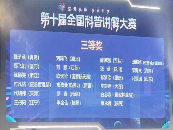 5月26日,bat3652022级研究生陈舒婷通过大连市科普达人秀比赛初选,作为大连代表队两名参赛选手之一参加全国科普讲解大赛。11月10日,第十届全国科普讲解大赛决赛在广州落下帷幕,陈舒婷荣获三等奖。