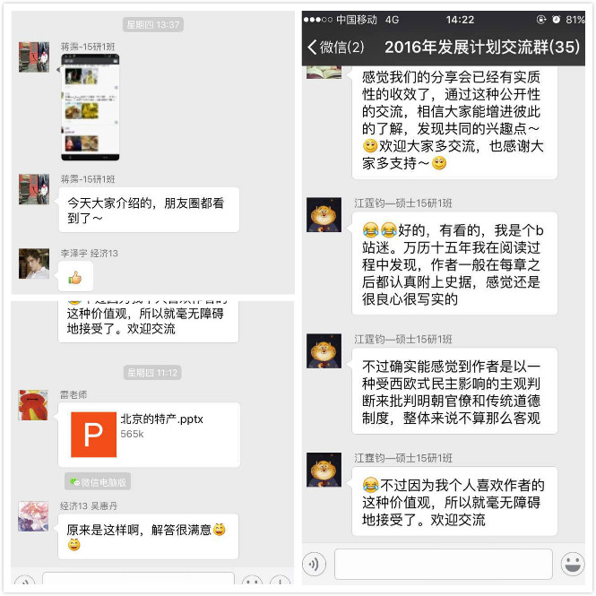 自3月24日以来,本季“分享会”已经成功举办3期,beat365在线体育官网登录入口党总支副书记雷洪峰、12级本科辅导员谢文娟、15级本科辅导员任晶、党务干事韩旭明以及68名本硕学生参与了分享活动。分享会上,先后有20名同学以“8分钟演讲”的形式呈现了自己的“所思所想”:在15级经济学班李明坤的“五月天”、郭立恒的“哲学和写作”;15级国民经济管理班魏子鑫的“爱好和大学生活”;吴婷的“摄影”以及15级研究生党支部江霆钧的“阅读”、苏婷的“我的大学”等多个话题中,分享者从自身兴趣与关注点出发的演讲,借助PPT、视频、音乐等形式,引发了同学们思想的碰撞和共鸣。