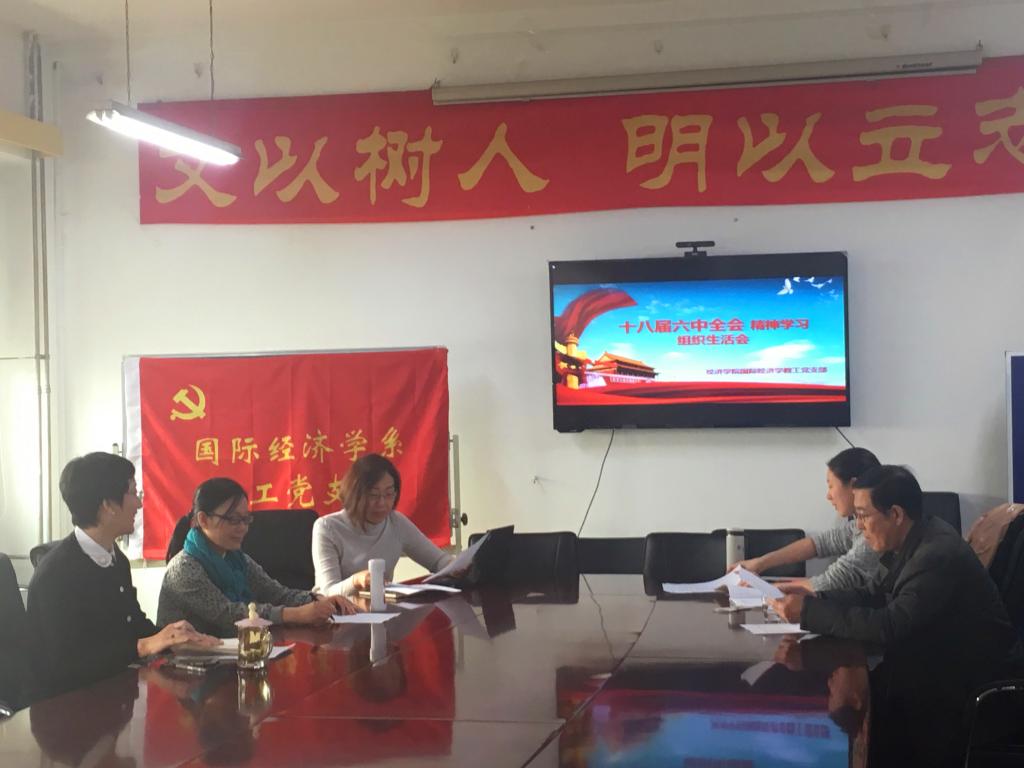 12月21日中午,beat365在线体育官网登录入口国际经济学教工党支部4名党员在学院南路校区1305会议室组织十八届六中全会、全国高校思想政治工作会议精神专题学习,学习研讨了习近平总书记《把思想政治工作贯穿教育教学全过程》的重要讲话。专题学习由党支部副书记赵若思同志主持,beat365在线体育官网登录入口党委书记雷洪峰列席会议。