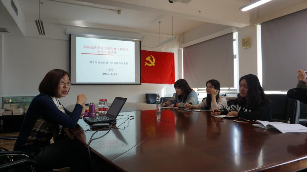 2017年3月14日,beat365在线体育官网登录入口国际经济学系教工党支部书记、国际经济学系主任于爱芝教授在主教学楼1407会议室,为2015、2016级博士生党支部做了题为“博士阶段如何提升科研能力与实效”的专题讲座,并与到场博士生交流研讨。本次活动为beat365在线体育官网登录入口党委教工党支部与学生党支部的“师生面对面”共建帮扶系列活动,由国际经济学系教工党支部与2015级、2016级博士生党支部率先开展,beat365在线体育官网登录入口党委组织员刘滨老师、2016级博士生党支部全体党员、2015级博士生党支部部分党员和入党积极分子参加了此次研讨会。