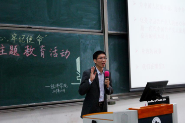 陈斌开从身边故事——开国少将甘祖昌将军的革命事迹入手,从历史视角阐述了“共产党人的初心和使命”,最后鼓励全院学生秉持家国情怀,做实学问根基,努力做出更大贡献。