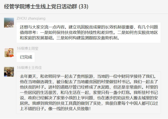 此次党日活动,党支部有效探索了疫情期间开展基层党建的新方式,充分调动了党员参加组织生活的积极性和主动性,真正提升了每一名共产党员的党性修养。同时,借助脱贫攻坚给每一个党员上了一次深刻的党课,大家深刻认识主题党日活动的重要意义,从严要求自己,在脱贫攻坚的关键时刻,切实发挥党员先锋模范和示范引领作用。最后周战强老师也寄语道:“今天讨论的贫困问题不仅是一个现实问题,还是很多学科都在关注和研究的问题。除了从经济学专业角度分析贫困问题外,还可以借鉴其他学科思路,进行跨学科研究,会有很多新的发现。”大家纷纷表示:要切实增强“四个意识”,坚决做到“两个维护”,以时不我待的政治责任感和紧迫感,积极参与支持脱贫攻坚工作,为打赢脱贫攻坚战贡献自己最大的力量。