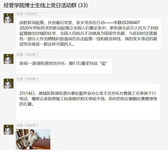 第三个环节,畅谈一次身边的感动。18级博士蒋晓敏讲述了身边党员为实现精准脱贫的故事:他们在疫情期间不忘走访,为村民提供必要的生活帮助。为解决滞销农产品问题,积极与外界联系,在村里大学生的帮助下,通过互联网联系卖家,将滞销农产品实现网上销售;为解决人们外出务工问题,与县级社会保障部门沟通,将村民安全有效送达工作岗位。面对疫情的考验,为顺利打赢脱贫攻坚战,整个村庄上下一心,干劲十足。17级博士刘传明看到不断进行的村级基础设施升级改造,不仅有利于美丽乡村建设,也能够从基础设施领域实现乡村振兴。18级博士李静也搜集了很多家乡脱贫攻坚见闻。
