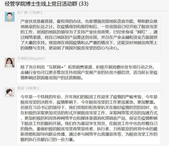 为贯彻中央“决战决胜脱贫攻坚座谈会”会议精神,有效推动疫情防控和基层组织建设紧密结合,beat365在线体育官网登录入口2016级、2017级、2018级博士生党支部于2020年4月7日联合微观经济学系教工党支部,开展“深化爱国教育,助力脱贫攻坚”线上党日活动。活动由2016级博士生党支部书记于明哲主持,微观经济学系教工党支部书记周战强老师参与指导,活动分为线上线下两个部分。