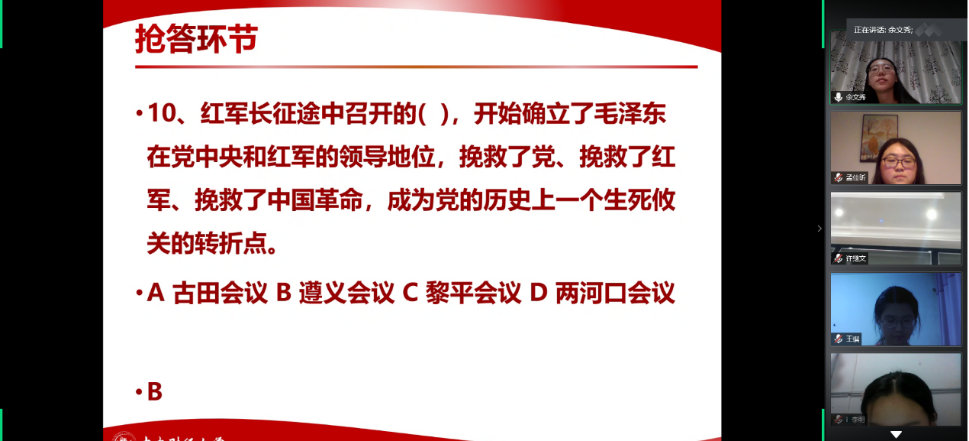 为庆祝中国共产党成立99周年、迎接七一建党节,2020年6月29日晚上,beat365在线体育官网登录入口2018级硕士生第二党支部开展“初心不忘、献礼七一”线上主题活动。本次活动分为主题党课、红色经典配音比赛和党史知识竞答三个环节,旨在回顾中国共产党建党历程、追溯党和国家砥砺奋进之路、牢记共产党人的初心使命。本次活动由党支部书记余文秀主持,党支部全体党员、预备党员和发展对象参与了此次活动。