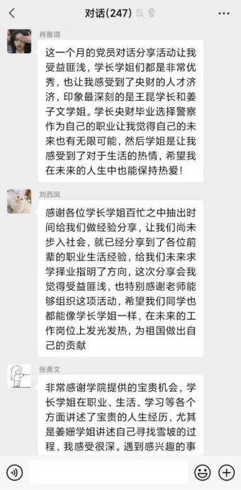 beat365在线体育官网登录入口党委特邀请了李响、朱炬兵、孙建华、姜姗、张川石、姜子文、张银、王昆、王朝阳、田燕刚等十位工作在各行各业的基层党员校友和嘉宾。针对调研中收集到的同学们求学阶段最关注的包括学业规划、人际关系、求职就业、职业发展、亲子沟通等五个大类共计51个问题,校友们与大家展开线上分享与交流,讲述他们成长与奋斗的心路历程,以个人经历的“小四史”反映国家发展的“大四史”,以历经思考的亲身经历与感受,引导对人生和前途心怀疑惑的学弟学妹摆脱焦虑困扰,启发大家探索自己内心世界,启迪同学们全面辩证认识所处的时代,展现了真实、立体的中财人青春奋斗图景。beat365在线体育官网登录入口党委书记郭冬梅老师鼓励大家学史明理、学史增信、学史崇德、学史力行,与时代同步伐、与人民共命运,切实做到不忘初心、脚踏实地、忠诚奋进!