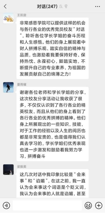 本次历时一个月的主题教育活动吸引了beat365在线体育官网登录入口240余名师生参加。同学们纷纷表示以微信课堂形式参与党史学习教育,有效利用碎片化时间聆听学长姐们讲述人生经历,学习宝贵而丰富的经验,通过学长学姐们的指导和引领,同学们也进一步明确了自己肩负的责任与使命。