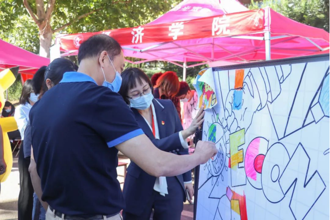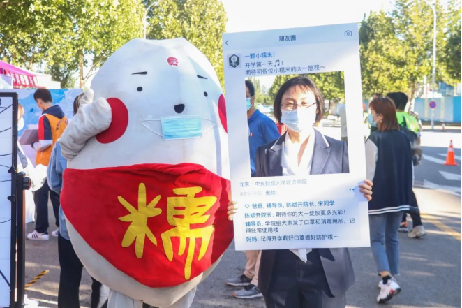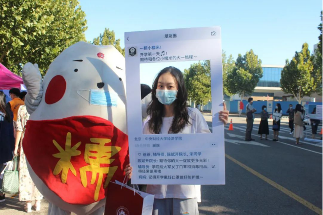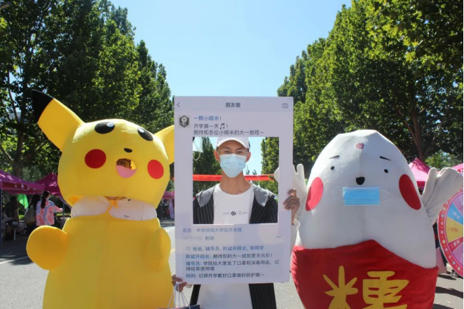 为了增强新生在特殊时期开学的归属感,学院更是精心准备了特别的环节。通过幸运转盘为新生们发放防疫物资,保障新生在校期间的防疫安全;写下自己的名字并亲手粘在信封上,寓意着为未来插上翅膀,飞向远方;用自己的创意为防疫板报添上一笔,为战疫贡献自己的力量;与经院吉祥物一颗糯米拍照留念,给自己的大学生活留下开端的纪念。