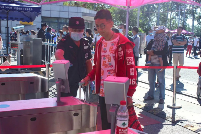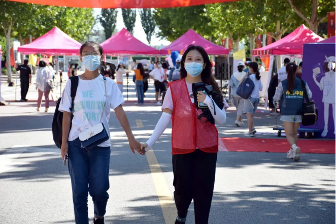 此时,校园门口的迎新工作井然有序。行李消杀、扫码签到、核酸检测证明等一系列防疫工作有条不紊地进行着。