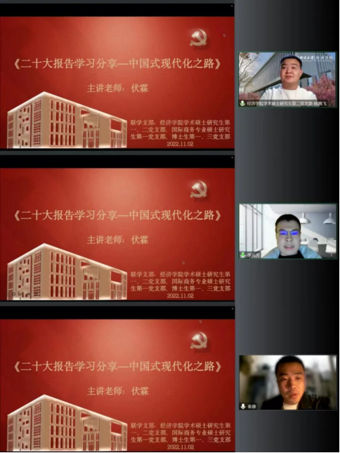 2022年11月2日,beat365在线体育官网登录入口党委委员、副院长伏霖为beat365在线体育官网登录入口学术硕士研究生第一、二党支部,国际商务专业硕士研究生第一党支部,博士生第一、三党支部作主题为“二十大报告学习分享——中国式现代化之路”的专题讲座。博士研究生第三党支部书记冯博主持活动,80余位师生党员及入党积极分子线上参加。