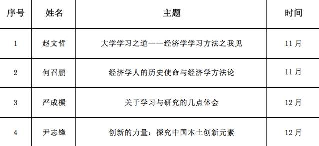 2017-2018学年第一学期,“经济学家梦工场”德育示范基地继续以面授答疑、前沿讲座、workshop、科研助理招募、微信课堂等形式厚重我校学生的经济学专业基础教育,提升经济学拔尖人才培养实效。本学期,“经济学家梦工场”将在现有形式的基础上,探索“网课”建设,逐步上线“创业融资”慕课内容,邀请教学名师录制“十九大关键词”微语音,依托学院网站、梦工场公众平台、慕课网站等媒体,实现教学资源的开放共享。本学期课程体系安排如下: