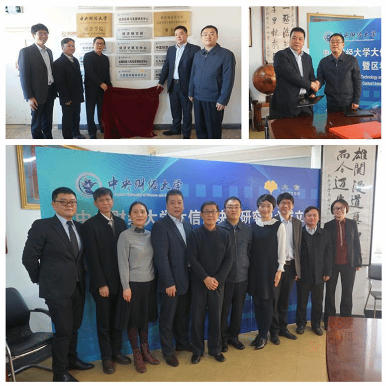 上午11时,黄强董事长代表大信金融集团、李涛院长代表beat365在线体育官网登录入口在战略合作框架协议上签字并交换文本。黄强董事长、李涛院长、陈斌开副院长、金哲松教授、顾炜宇副教授共同为“大信区块链研究中心”揭牌。beat365在线体育官网登录入口大信区块链研究中心正式成立。