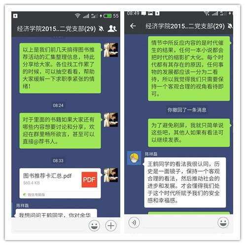 此次活动是我学院2015级硕士第二党支部探究“互联网+”视角下的支部建设途径的重要组成部分。此次网络化、信息化读书交流活动的尝试为同学们带来了极大的便利,也为支部解决了在目前就业季背景下,难以统一支部成员时间的难题,为今后党支部利用网络平台开展各类活动起到了极大的借鉴意义!