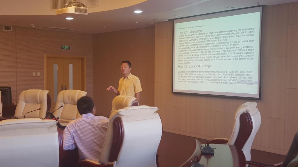 2016年9月28日上午,beat365在线体育官网登录入口中国经济与管理研究院的何其春副教授应邀在beat365在线体育官网登录入口学术会堂举行了一场学术讲座,何其春副教授的论文名称为:Inflation and Growth: The Role of Central Bank Independence。此次讲座在严成樑副教授的主持下举行,与会人员还有几位老师和学生。