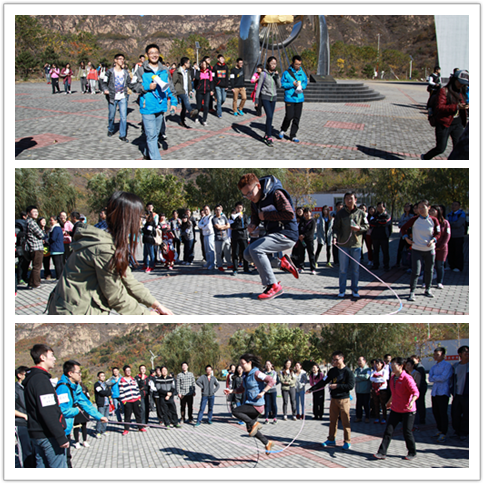 参观结束后,师生开展了趣味盎然的素拓活动。同学们在老师的带领下分组参加跳大绳比赛。比赛以小组为单位,每组有两名挥绳者,一名伴奏(唱歌)者,若干名跳绳者。老师们身手矫健,同学们生龙活虎。刹那间,大绳挥动的声音,师生爽朗的笑声,大伙儿一起计数的声音,伴奏者动听的歌声,回荡在山林里。各组的师生配合默契,力争第一,此处看不到课堂上的拘谨,只有阳光下师生运动、欢笑的身影。