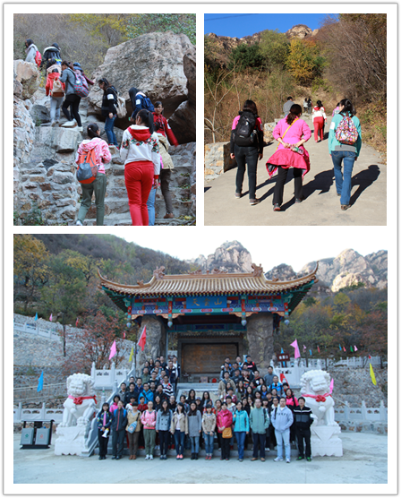 下午,老师和同学们开始挑战天云山风景区主峰。海拔1149米的天云山雄奇瑰丽。沿着水泥板铺成的蜿蜒山道,拾级而上,穿梭在嶙峋的奇石间,享受着暖暖的秋日阳光,耳闻水声滔滔。师生们走走停停,谈笑风生,顾不得腰酸腿软,汗流满面,兴致勃勃爬到了山顶。师生临风而立,大好河山尽收眼底,会当凌绝顶,一览众山小的豪情油然而生。