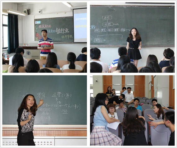 beat365在线体育官网登录入口2009级优秀硕士邵冉校友分别于6月11日下午和6月18日下午在学院南路校区和沙河校区做了题为“触手可及的银行业”的专题讲座。邵冉校友先后在光大银行、民生银行任职,具有较丰富的银行从业经验。交流会上,她就国内银行体系及商业银行运营特点,主营业务等作了系统的讲解。她还结合自己在运营及理财营销环节的亲身经历,形象生动地谈到自己是如何明确自身职业认知,以及如何进行短期和长期的职业生涯规划,并告诫学弟学妹们不断完善自我,脚踏实地做好每一件事情,逐步实现职业目标。在互动提问环节,同学们就银行业面试的技巧、从业需要的技能以及岗位的选择等问题与邵冉校友进行了交流。