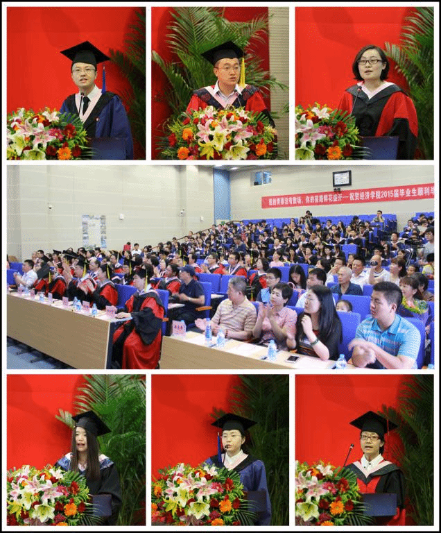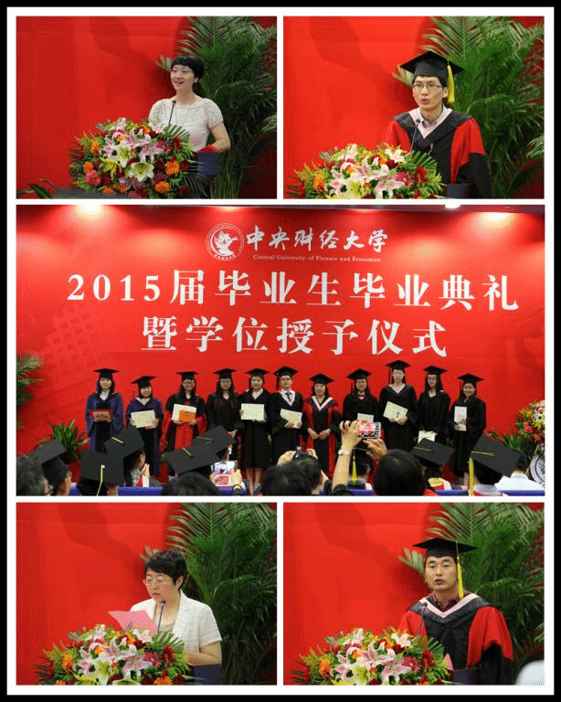 在接下来的毕业感言环节,beat365在线体育官网登录入口2015届本科生,即将赴瑞典斯德哥尔摩大学深造的张静一同学表达了她与中财、与经院一路走来的感情,“真实的beat365在线体育官网登录入口是什么样子?远比我们任何人想象的丰富,远比我们任何人想象的包容,也远比我们任何人想象的精彩”;15届的硕士毕业生,在beat365在线体育官网登录入口求学六年的朱俊兵则在赴柏林自由大学读博前夕,用平实的语言叙述了“六年磨一剑”的心路历程,表达了对经院师长的无尽热爱;而本届的博士毕业生,来自国民经济学专业的冉美丽,则风趣地把博士阶段的求学研究比作“先作茧自缚,再化茧成蝶”的过程。师长寄语中,曾任beat365在线体育官网登录入口09、10、11、12级辅导员、团总支书记,今年从财政学专业硕士毕业的麻富根从自己独特的角度,叙述了自己眼中的经院,自己眼中的人才培养,自己眼中的人生选择,表达了对经院师生真挚的情感;beat365在线体育官网登录入口郭冬梅老师表达了对毕业生殷切的希望,她勉励毕业生摆正工作和生活的心态,任何问题总有解决的办法,“即使没有解析解,也会有数值解”。