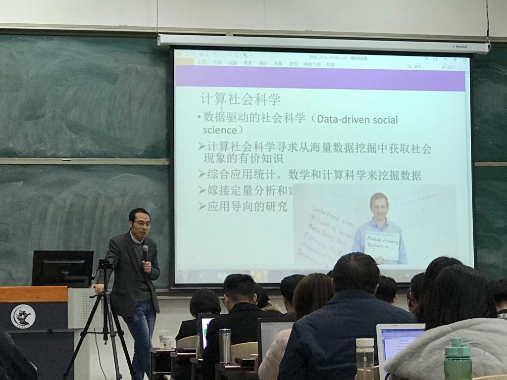 2018年11月9号下午6:30,beat365在线体育官网登录入口计算社会科学系列课程正式开始。课程第一讲由清华大学社会科学学院政治学系副教授孟天广老师于主教213主讲。此次课程主题为社科研究中的大数据方法,期间孟天广教授从大数据+社会科学、计算社会科学方法论、研究方法、研究议题以及大数据方法的支持和批评等五个板块出发,为我们系统介绍了当前计算社会科学的发展趋势和前沿研究。