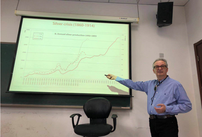 GeorgesDepeyrot教授首先详细介绍了19世纪世界货币体系的演变和革命,通过播放一段历史纪录片展示了旧时期沉船打捞中发现的大量金币并让大家初步了解了16世纪-19世纪美国的“淘金热”现象。在此基础上,GeorgesDepeyrot教授对新矿的发展进行了深入分析,他认为新的金矿与银矿的开发极大地促进了全世界金属出口贸易的发展。GeorgesDepeyrot教授还向大家分享了他主持研究的DAMIN国际项目,深入分析了1860年—1914年全世界范围内发生的白银危机,并且对1492年—1893年的世界白银价格做了详细的解读。他认为,银矿的开发、工业革命所带来的铸币技术的提升和全球贸易的日益繁荣等共同引发了白银的贬值危机。此外,GeorgesDepeyrot教授结合当前中国经济发展形势,以上海为例,与在场的老师们共同探讨了中国与其他国家在海上贸易方面的共同点和差异点。