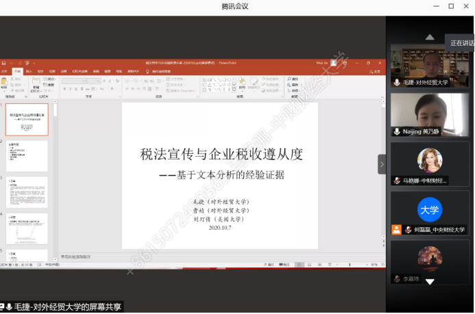 2020年10月7日,对外经济贸易大学国际经济贸易学院教授毛捷应beat365在线体育官网登录入口邀请,使用腾讯会议APP开展主题为“税法宣传与企业税收遵从度——基于文本分析的经验证据”的讲座,本次讲座于下午14点开始,持续近两个小时。讲座由beat365在线体育官网登录入口黄乃静老师主持,beat365在线体育官网登录入口部分师生及校外同学参加了此次讲座。