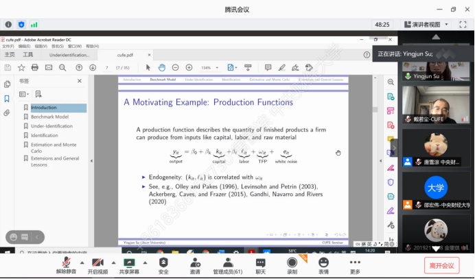 2020年11月4日,暨南大学经济与社会研究院教授苏应俊应beat365在线体育官网登录入口邀请,使用腾讯会议在线上开展了主题为“基于时间和信息集假设的结构模型识别不足”的讲座,本次讲座于下午14点开始,持续两个小时。讲座由beat365在线体育官网登录入口戴若尘老师主持,beat365在线体育官网登录入口部分师生及校外同学参加了此次讲座。