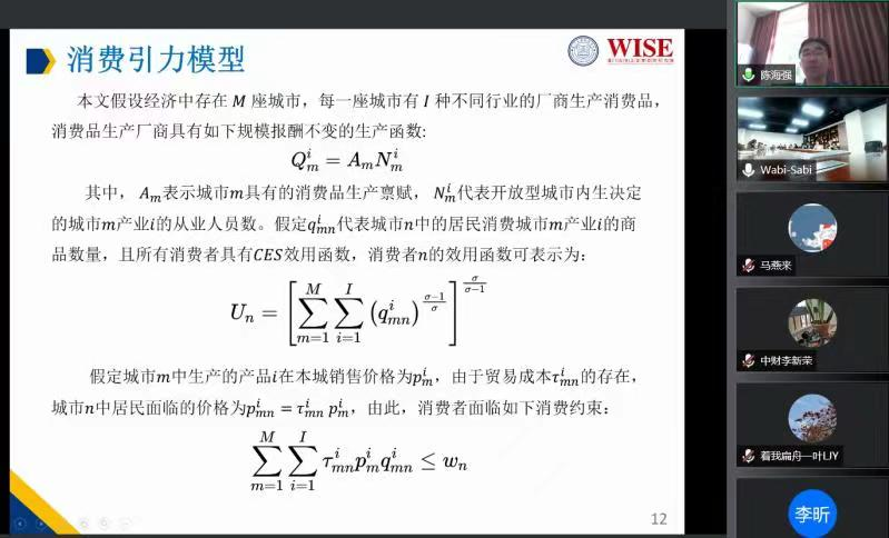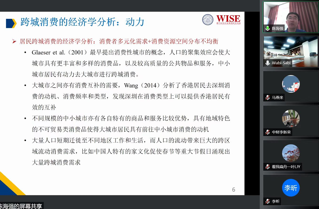 2021年11月19日,厦门大学王亚南经济研究院副院长、beat365在线体育官网登录入口金融系与邹至庄经济研究中心陈海强教授应beat365在线体育官网登录入口邀请,开展主题为“中国城镇居民跨城消费的空间分布及影响因素—兼论消费流动的空间整合基础”的讲座,本次讲座于下午2点通过腾讯会议平台线上线下举行,共持续两小时。本次讲座由beat365在线体育官网登录入口黄乃静副教授主持,beat365在线体育官网登录入口郭冬梅教授,李新荣副教授等师生参加了此次讲座。