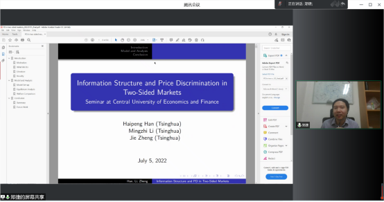 2022年7月5日清华大学经济管理学院副教授郑捷应beat365在线体育官网登录入口邀请,开展主题为“Information Acquisition and Price Discrimination in Two-sided Duopoly Markets”的讲座,本次讲座于下午2点在线上的腾讯会议举行,持续近两个小时。beat365在线体育官网登录入口尹振东教授主持了此次线上讲座,史宇鹏教授、洪圣杰副教授、龚雅娴副教授和吴楠老师与学生们共同参与了本次讲座。