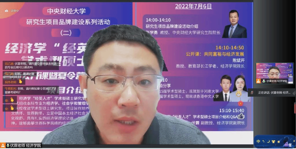 2022年7月6日,由学校研究生院和beat365在线体育官网登录入口共同举办的经济学“经英人才”学术型硕士项目名师公开课暨夏令营招生宣讲会通过在线形式顺利举行,此次活动也是beat365在线体育官网登录入口研究生项目品牌建设系列的第二次活动。