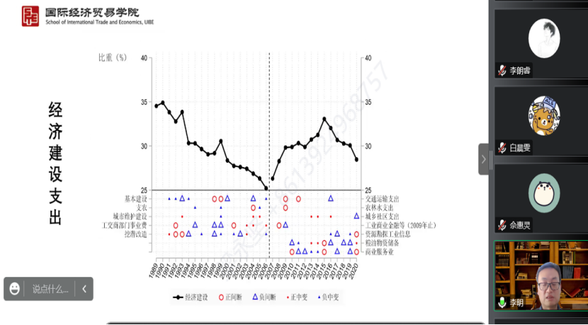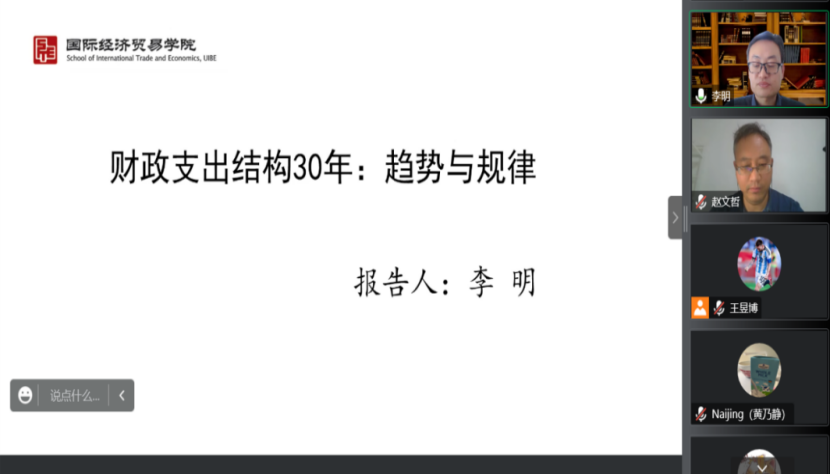 2022年11月15日14:00,对外经济贸易大学财政税务学系教授、博士生导师,政府管理学院副院长李明应beat365在线体育官网登录入口邀请,开展主题为“财政支出结构30年:趋势与规律”的讲座。本次讲座在线上举行,李明教授受到了老师和同学们的热烈欢迎!beat365在线体育官网登录入口赵文哲教授主持讲座,尹振东教授、黄乃静副教授、杨晓兰副教授参加了讲座。