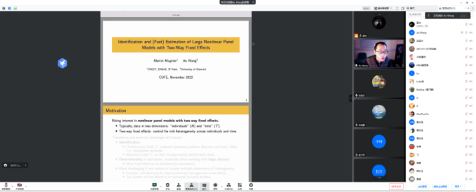 2022年11月24日16:30,华威大学经济学助理教授,华威大学全球经济竞争优势研究中心(CAGE)副研究员王骜(Ao Wang)应beat365在线体育官网登录入口邀请,进行了主题为“Identification and (Fast) Estimation of Large Nonlinear Panel Models with Two-Way Fixed Effects”的讲座。本次讲座在线上进行。王骜教授受到了beat365在线体育官网登录入口老师与同学们的热烈欢迎。beat365在线体育官网登录入口洪圣杰副教授主持讲座,黄乃静副教授参加了讲座。