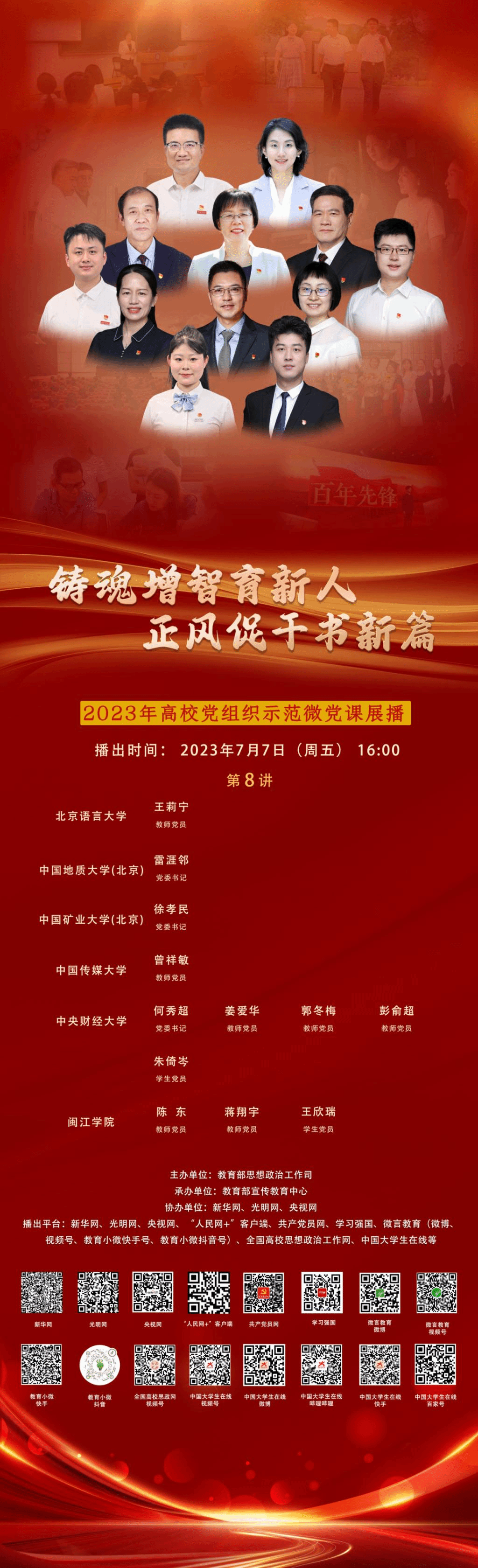 7月7日,由教育部思想政治工作司主办,教育部宣传教育中心承办的“铸魂增智育新人,正风促干书新篇”微党课第8讲正式上线。我校党委书记何秀超,北京市优秀共产党员、财政税务学院教授姜爱华,beat365在线体育官网登录入口党委书记郭冬梅,金融学院副院长、金融科技系教工党支部书记彭俞超,北京高校优秀共产党员、马克思主义学院博士研究生朱倚岑,为全国高校师生带来题为《在中国式现代化新征程中贡献中财大力量》的示范微党课。