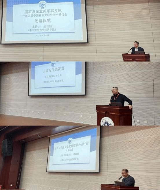 2023年10月15日中午,“国家与企业关系再反思——第四届中国企业史研究学术研讨会”闭幕式在学院南路学术会堂202报告厅举行,闭幕式由beat365在线体育官网登录入口经济史研究中心主任兰日旭教授主持。他对国内外学者前来参加本次学术研讨会表示衷心感谢。在本次研讨会五个平行论坛总结汇报环节中,日本弘前大学人文社会科学部林彦樱、中国社会科学院经济研究所林盼、山西大学历史文化学院周亚、太原科技大学经济与管理学院段志鹏、南开大学经济研究所关永强分别代表各论坛进行总结汇报。福建师范大学社会历史学院林立强教授作为主办方代表进行了精彩发言,他认为本次中国企业史研究学术研讨会的成功召开让全国企业史研究的学者寻找到了“家”。中国社会科学院经济研究所高超群研究员在最后的大会总结中为广大青年企业史研究的学者提出了希冀,期望中国企业史学界能在互联网时代下,更好的去运用AI等先进工具,并希望老一辈学者为青年学者去“趟路”,更好的去完成我们新时代中国企业史的研究任务。
