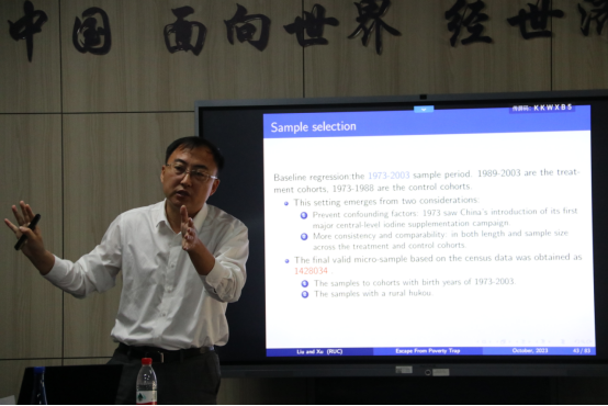 2023年10月24日,中国人民大学国家发展与战略研究院刘瑞明教授应beat365在线体育官网登录入口邀请,开展主题为“Escape From Poverty Trap: The Eradication of Iodine Deficiency Disorders and Migration of Rural Residents in China”的讲座,刘瑞明老师受到了老师和同学们的热烈欢迎!beat365在线体育官网登录入口陈斌开院长主持了讲座,赵文哲老师、张佳梁老师、谢婷婷老师参加了讲座。
