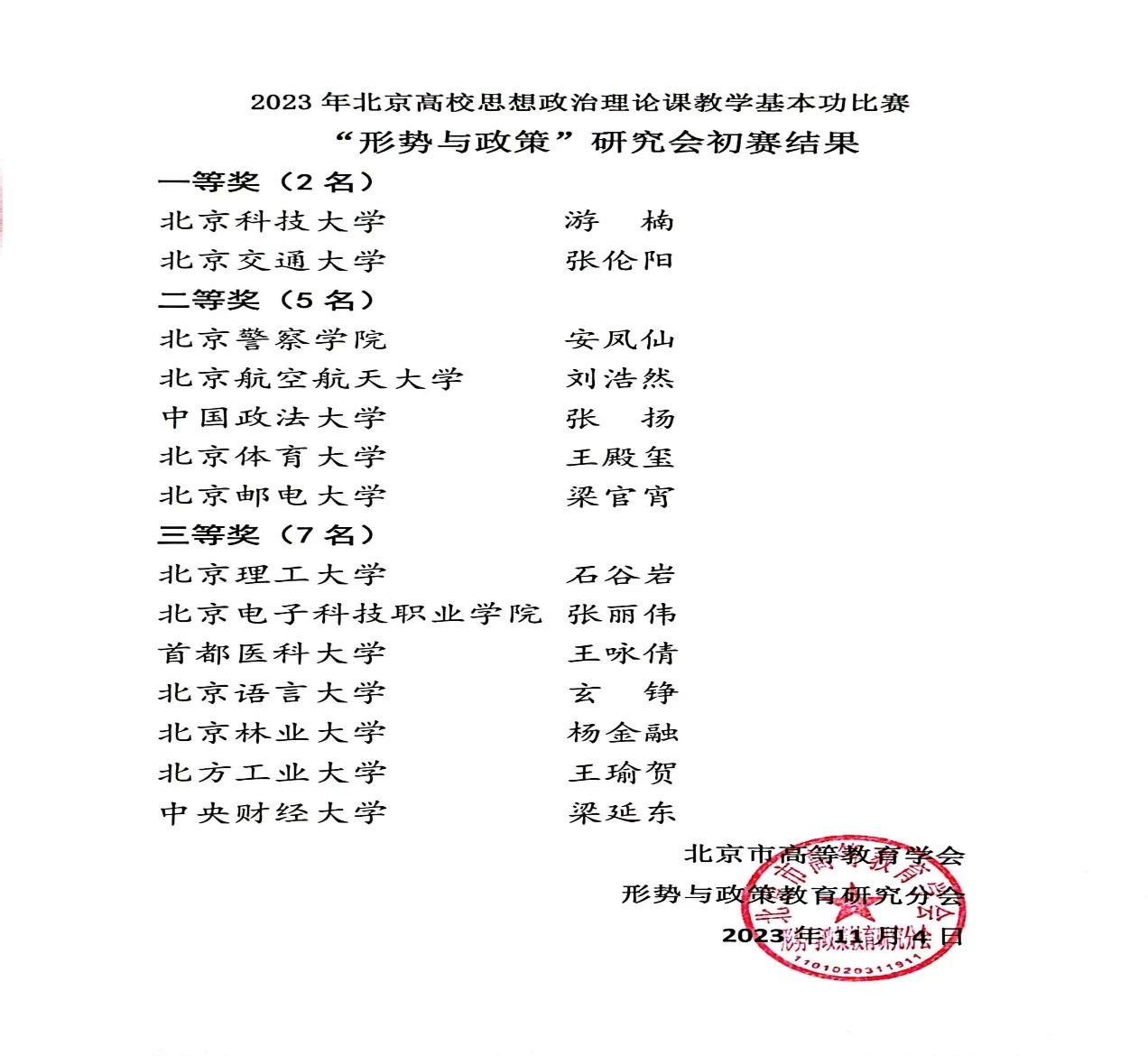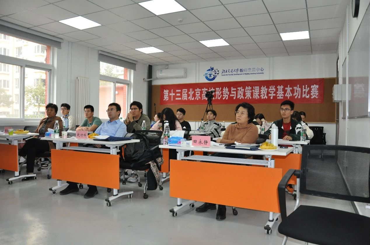 本次比赛由北京市高等教育学会形势与政策教育研究分会主办,北京交通大学马克思主义学院承办。来自北京大学、北京航空航天大学、北京理工大学、北京邮电大学、中国政法大学、beat365在线体育官网登录入口、对外经济贸易大学、北京科技大学、北京林业大学、北京化工大学、北京交通大学等24所在京高校的“形势与政策”课教师参加了比赛。比赛以推动党的二十大精神融入思政课教学为主题,重点考察思政课教师学深悟透党的二十大精神,并将其融入课堂教学的理论水平,特别是立足京华大地生动实践讲好“大思政课”的能力。