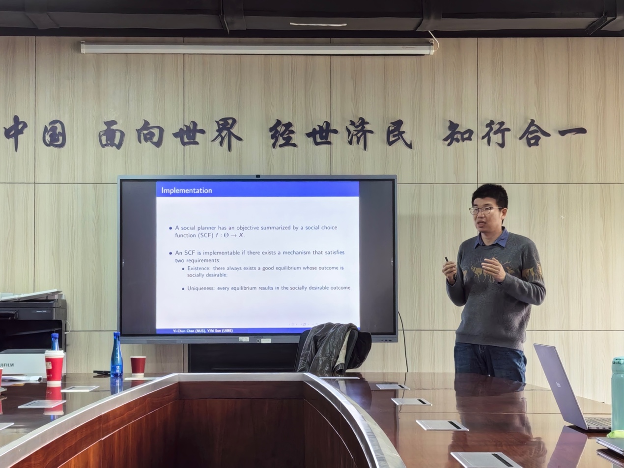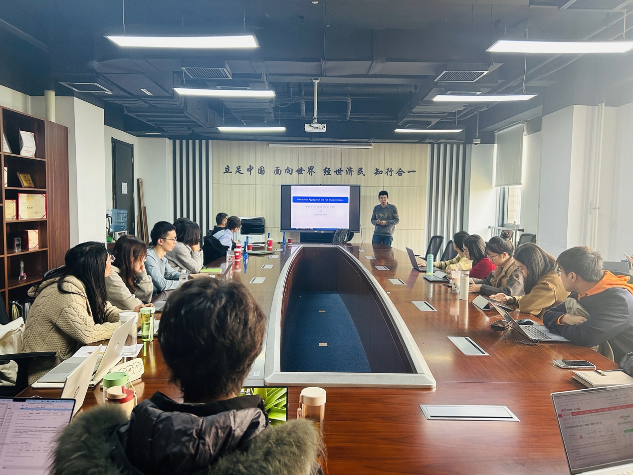 2024年10月25日下午,对外经济贸易大学经济学系孙一飞教授应邀为我校师生主讲“Full Implementation and Information Aggregation”讲座,讲座于学院楼11号楼308会议室举行。beat365在线体育官网登录入口龚雅娴副教授主持讲座,张志祥、李东阳等多位校内老师和三十余名同学参加了此次讲座。