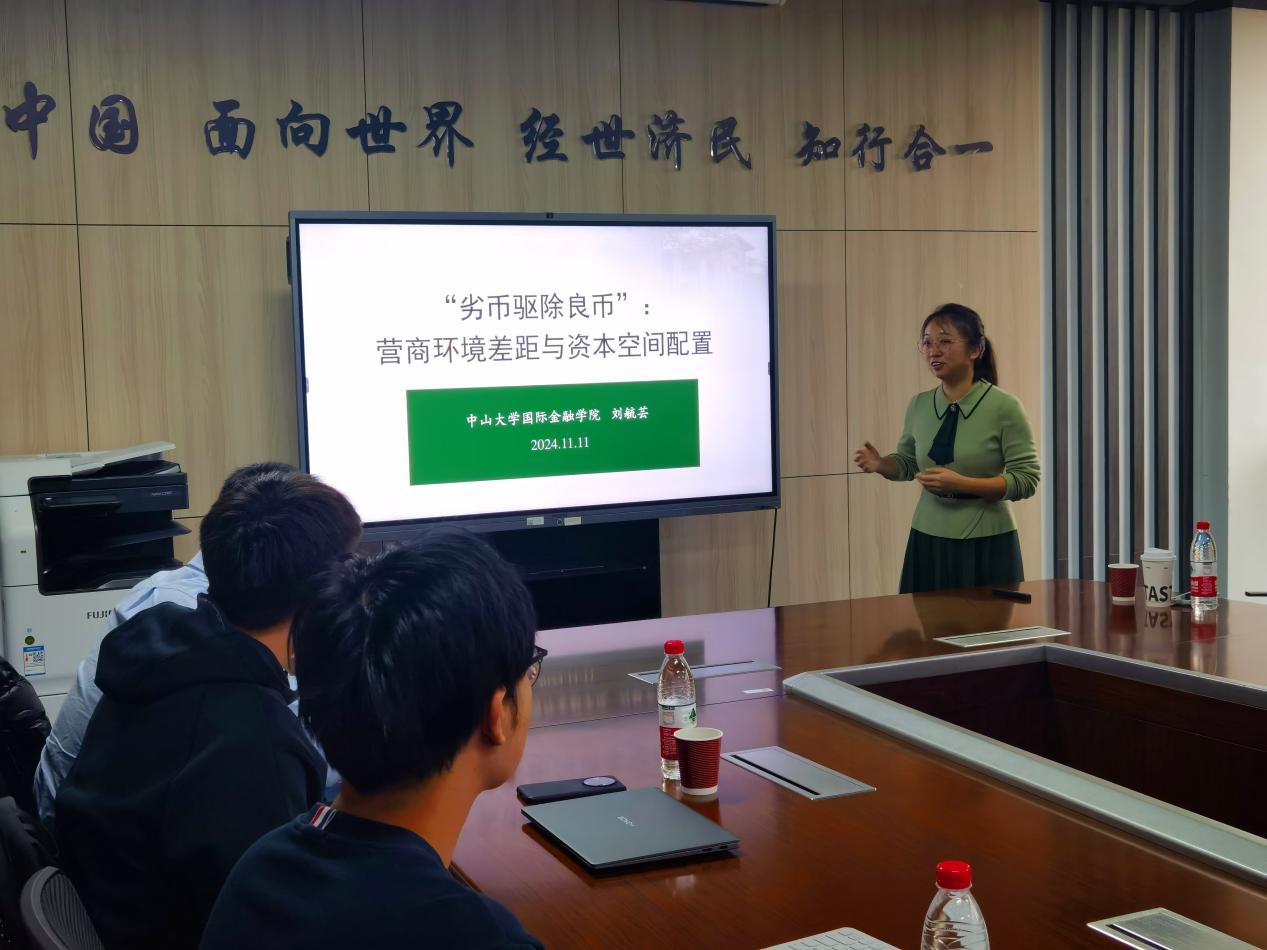 2024年11月11日上午,中山大学金融学院刘毓芸副教授应邀为我校师生主讲““劣币驱除良币”:营商环境差距与资本空间配置”讲座,讲座于学院楼11号楼308会议室举行。beat365在线体育官网登录入口副院长伏霖副教授主持讲座,方海东老师和十余名同学参加了此次讲座。