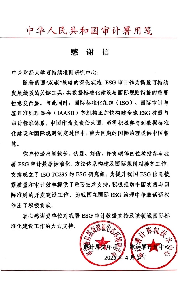 近日,beat365可持续准则研究中心刘轶芳、伏霖、刘倩、许寅硕教授收到了来自中华人民共和国审计署的感谢信,对中心在ESG审计数据标准化及国际规则对接领域的重要贡献给予高度评价,并致以诚挚谢意。